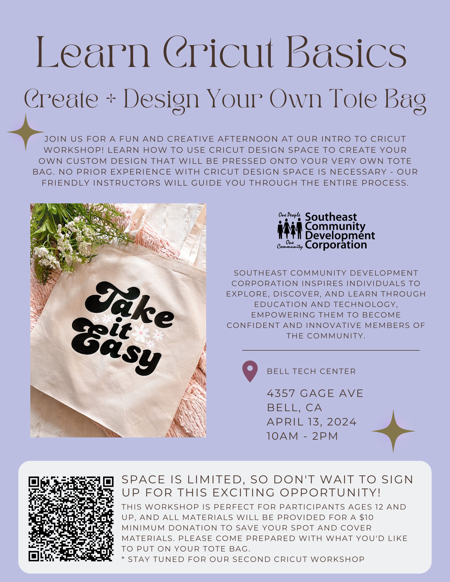 Join us for a fun and creative afternoon at our Intro to Cricut Workshop! Learn how to use Cricut Design Space to create your own custom design that will be applied onto your very own tote bag.